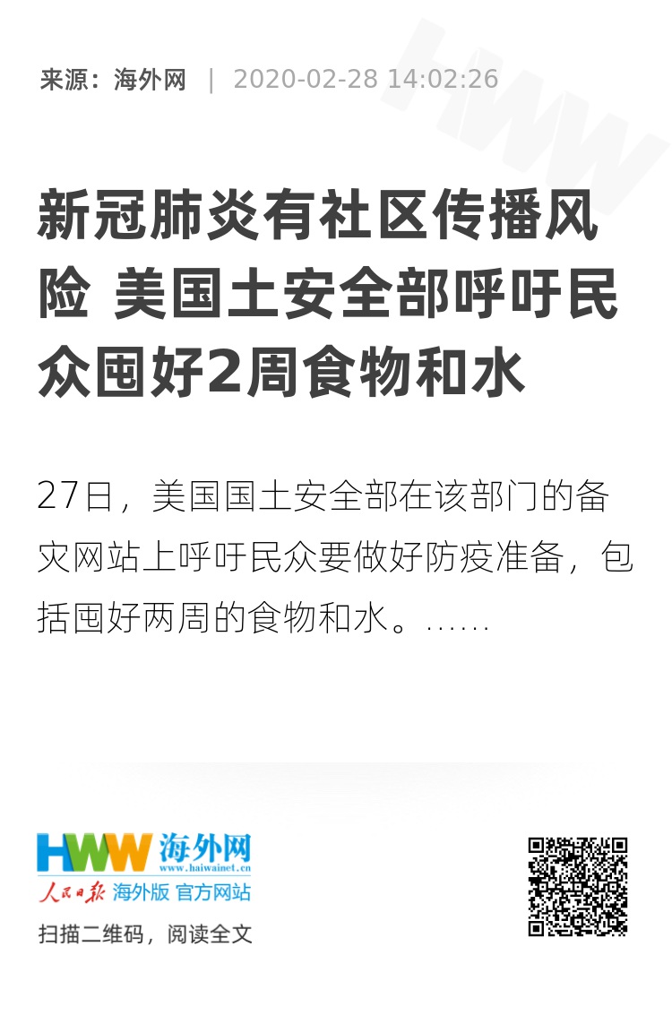 海外网2月28日电 截至当地时间26日,美国已有新冠肺炎确诊病例60例,并存在社区传播的风险。美国国土安全部在该部门的备灾网站上呼吁民众要做好防疫准备,包括囤好两周的食物和水。