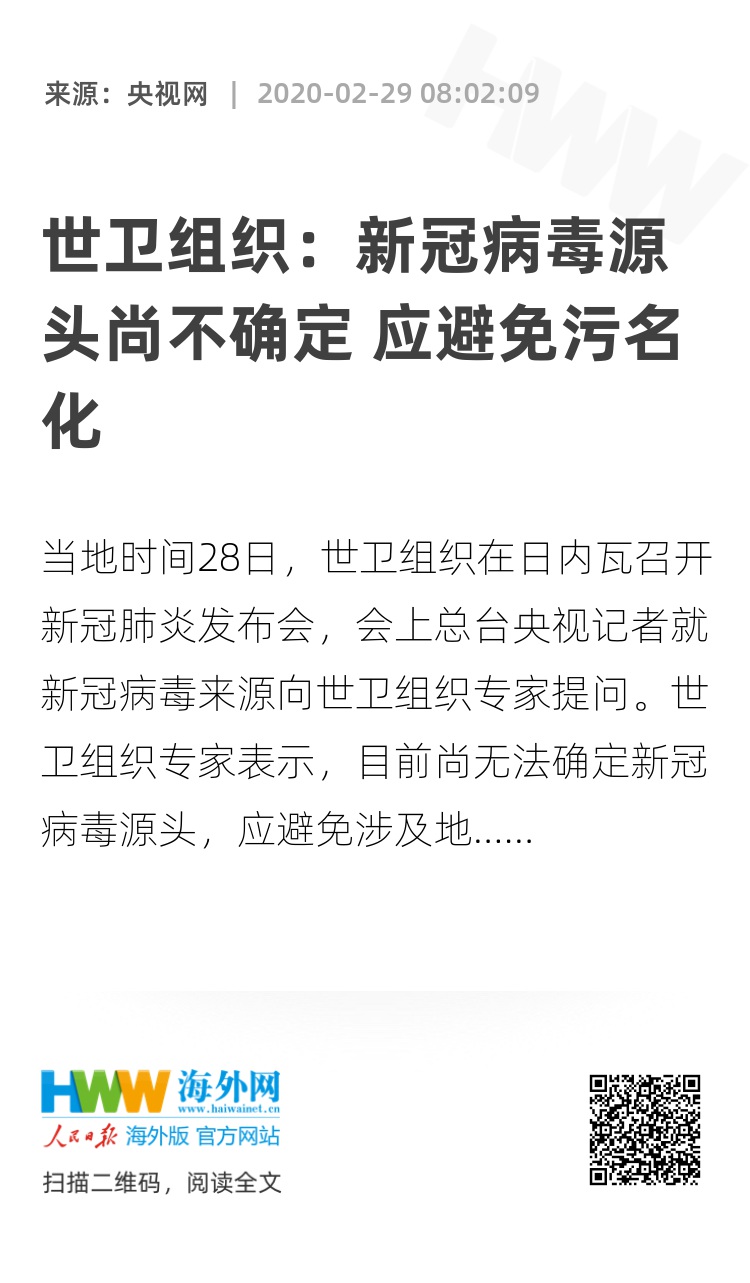 世卫组织卫生紧急项目负责人 迈克尔·瑞安:关于任何疾病的来源,任何地方都有可能。冠状病毒是全球现象,在全世界都存在。它们在某个地方出现,是自然史上的不幸事件,重要的是我们不要去责怪其地理来源,而是关注如何应对及遏制病毒。当然我们需要了解病毒的来源以便于控制它,避免其再度来袭,而不是去责怪谁,或是哪种可怜的动物的过错,动物没有错。我们要小心自己的语言,不幸的是,污名化的语言及指责成为全球描述(用语)的一部分,这没有益处。