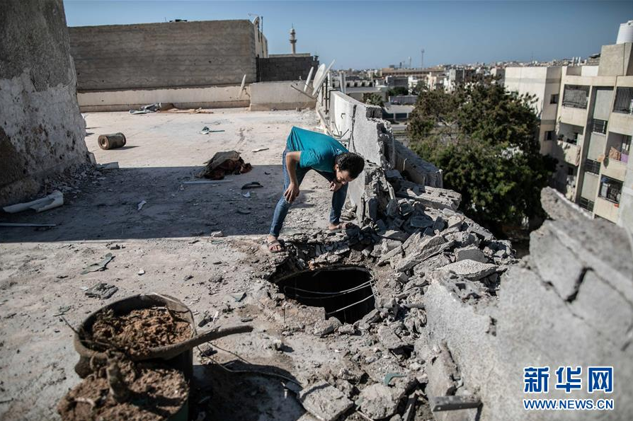 2月28日,在利比亚首都的黎波里,一名男子检查被火箭弹损毁的居民楼。 利比亚民族团结政府军方28日发表声明说,利首都的黎波里米提加国际机场及周边地区当天遭到火箭弹袭击,导致机场关闭,所有航班停航。 新华社发(阿姆鲁 摄)