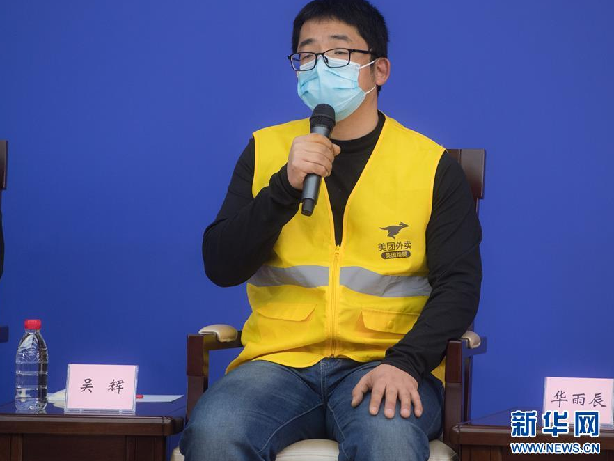 国务院新闻办公室在湖北武汉举行国务院新闻办记者见面会,邀请在武汉疫情防控一线的普通工作者讲述他们团结奋战的故事,并回答记者提问。这是外卖骑手吴辉在记者会上(2月23日摄)。 新华社记者肖艺九摄