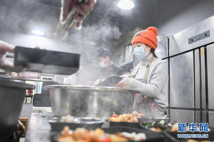 “雨衣妹妹”刘女士在位于武汉光谷青年城的餐饮门店厨房里分装盒饭(2月26日摄)。 新华社记者 程敏 摄