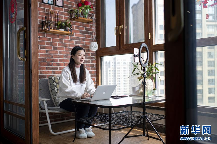 心理咨询师王怿在武汉的家中进行公益直播,对观众进行心理疏导(2月22日摄)。新华社记者 熊琦 摄