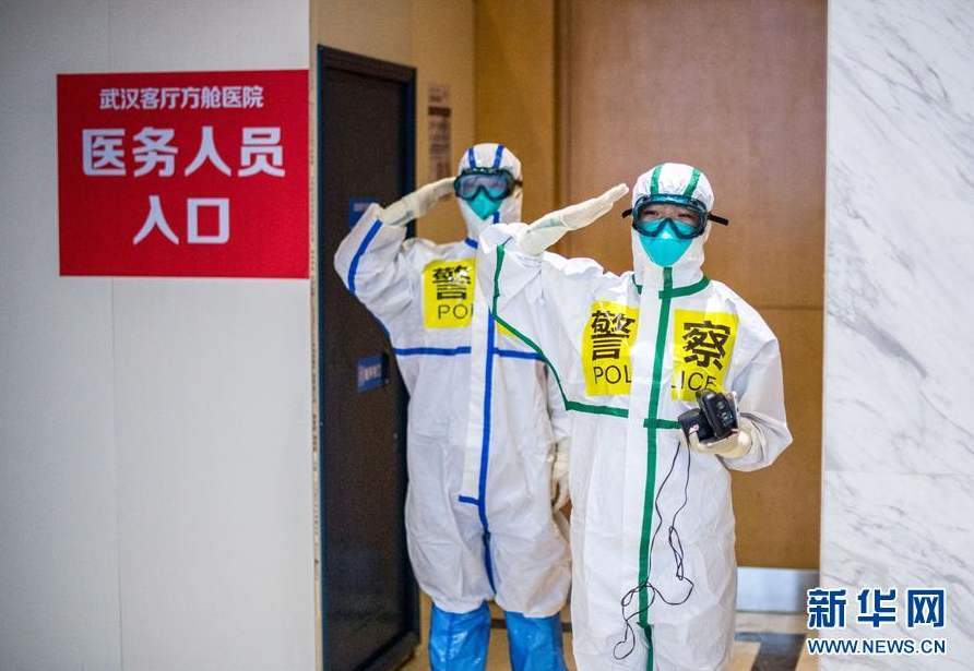 在武汉客厅方舱医院,来自武汉市东西湖区公安分局的民警张锦星(右)与同事刘晨在进方舱前向同事敬礼(2月25日摄)。 新华社记者肖艺九摄