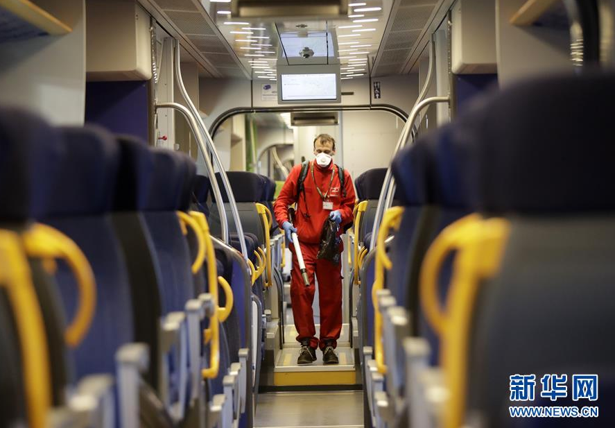 2月28日,在意大利米兰加里波第火车站,工作人员给车厢消毒。新华社发(阿尔贝托·林格里亚摄)