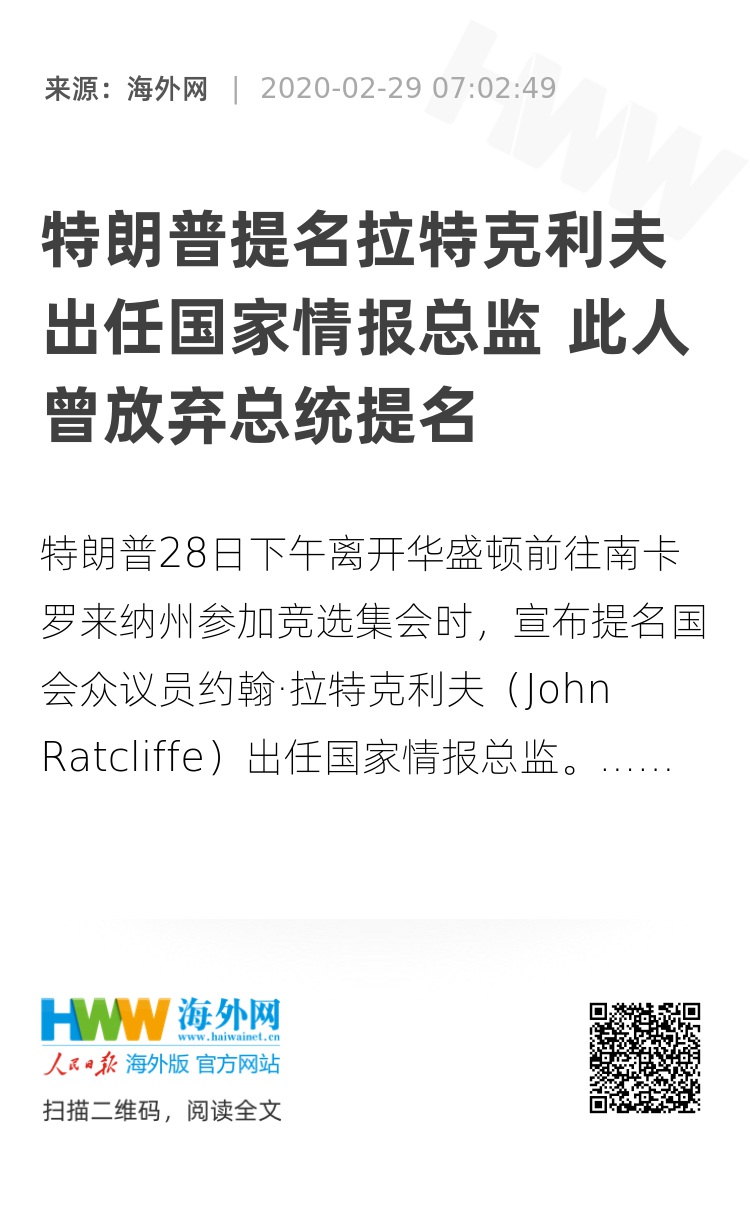 事实上,这是拉特克利夫第二次被提名出任美国国家情报总监。2019年7月28日,特朗普提名拉特克利夫担任国家情报总监,不过5天后,特朗普又决定放弃这一提名,拉特克利夫随后也宣布退出提名过程。