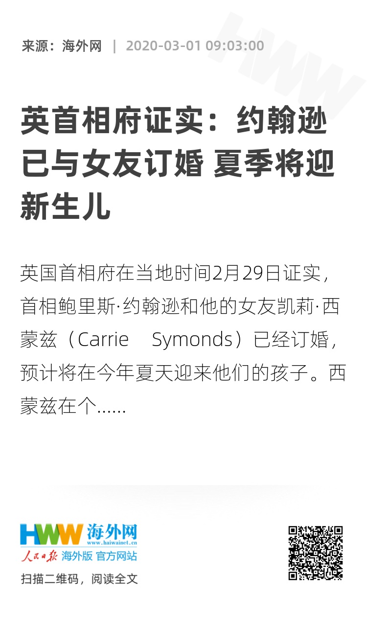 海外网3月1日电 英国首相府在当地时间2月29日证实,首相鲍里斯·约翰逊和他的女友凯莉·西蒙兹(Carrie Symonds)已经订婚,预计将在今年夏天迎来他们的孩子。