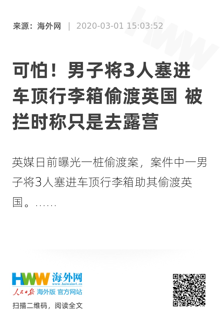 海外网3月1日电 英媒日前曝光一桩偷渡案,案件中一男子将3人塞进车顶行李箱助其偷渡英国,在被警方拦截检查时该男子竟表示,行李箱中的“物品”仅是露营所需的东西。