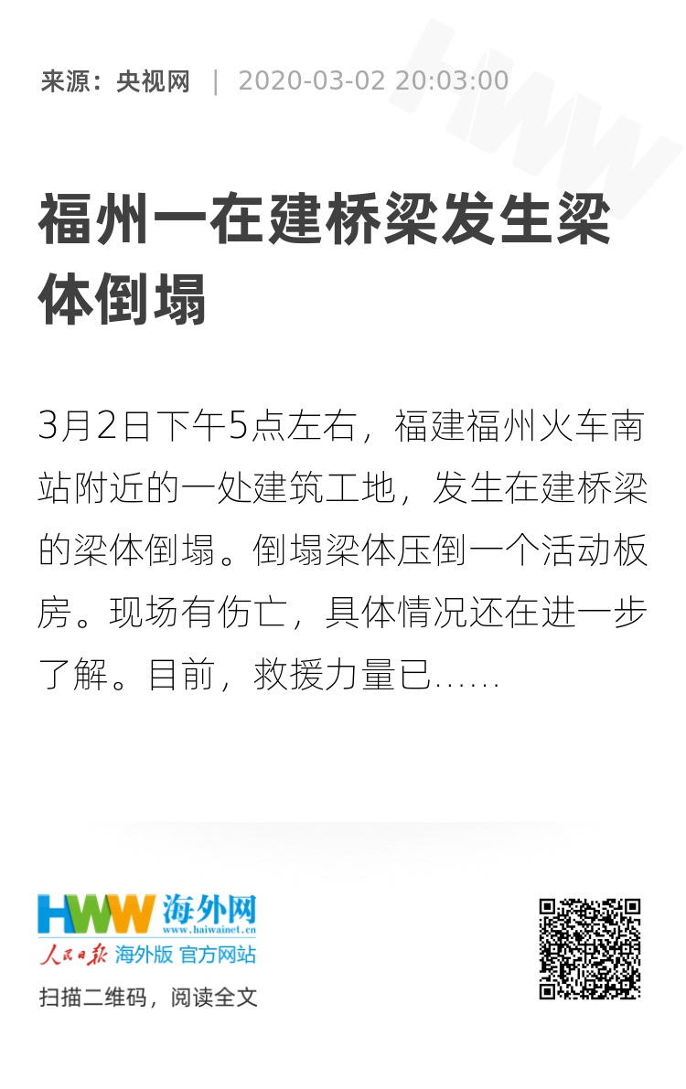 3月2日下午5点左右,福建福州火车南站附近的一处建筑工地,发生在建桥梁的梁体倒塌。倒塌梁体压倒一个活动板房。现场有伤亡,具体情况还在进一步了解。目前,救援力量已赶到现场。(总台央视记者 林舟)