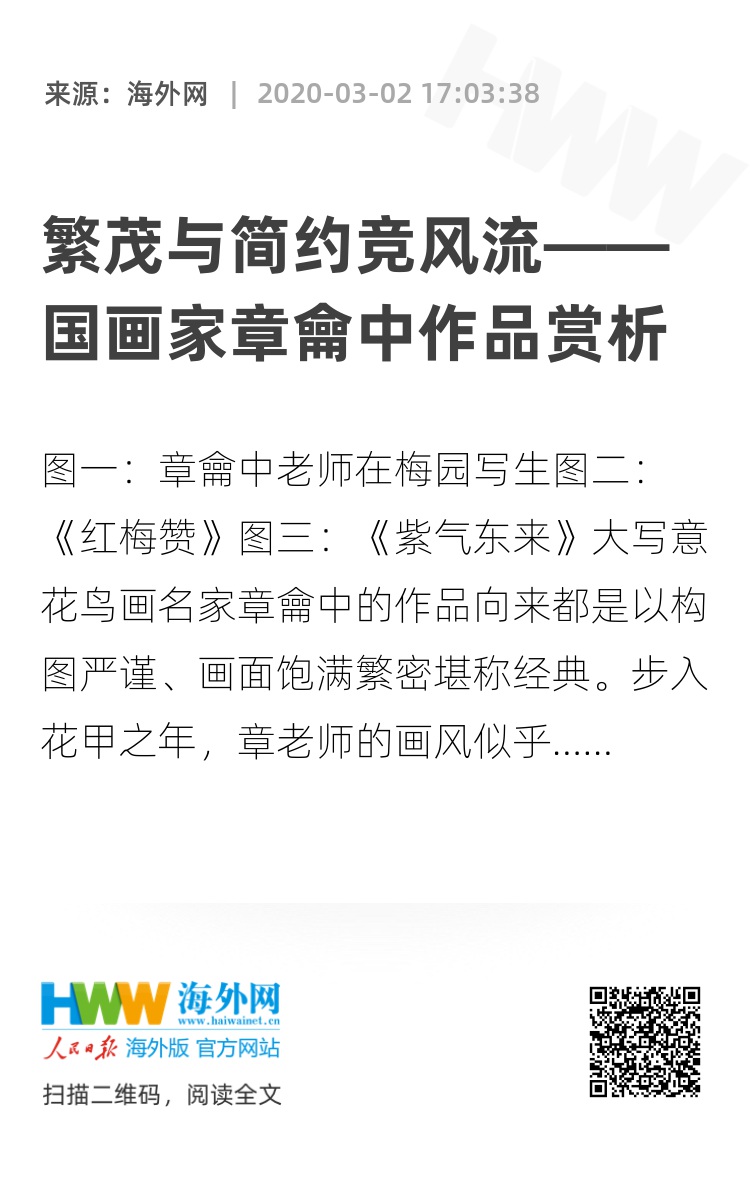 亦繁亦简皆随自然,步入花甲之年,章老师的感悟是,中国画要恪守传统,讲究精致的笔墨,繁简根据意境的需要而定。自己近40年的积累,由简到繁,又删繁致简,是艺术发展的渐进过程。前者的“简”是简单的、较为初级的东西,后者的“简”是笔墨的精炼,是画家自我对物象高度概括以后的精华,是从低级向着高级发展的标志。“简”根植在繁的基础上,没有繁就不可能有简。删繁趋简,儒理、禅机、画趣,理应做探索和追求。章龠中表示,在大作品创作上,继续保留对繁复布局的攀登,又有大块时间和精力对简约小品的突破,双手互搏,勇攀艺术巅峰。