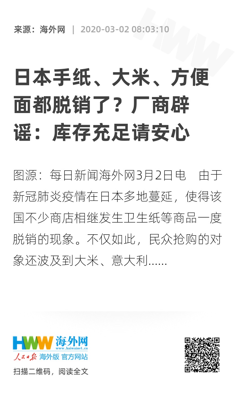 另一方面,日本家庭纸工业会方面表示,纸制品几乎都在日本国内都有生产,库存十分充足。该机构表示,“虽然部分地区一时难以购买,但是物流一齐备就会送到消费者手中,请大家放心”。(海外网 吴倩)