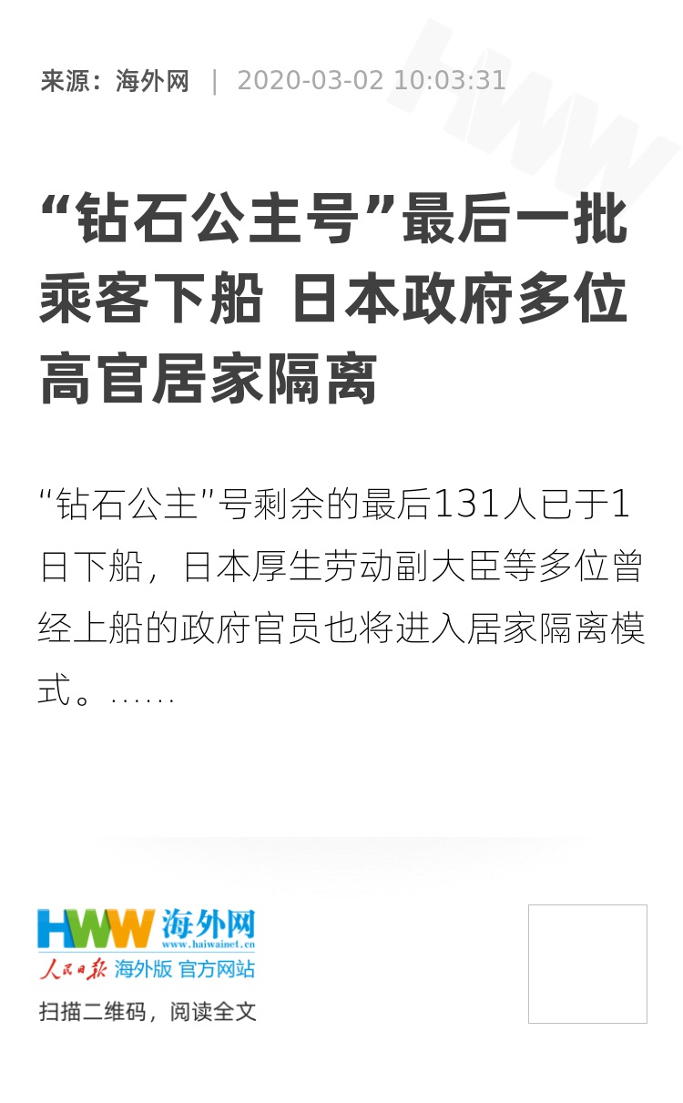 日本厚生劳动大臣加藤胜信表示,“在巨大的邮轮上完成检疫工作是一项前所未有挑战,我向接收相关医护人员和患者的各界人士等表示感谢”。