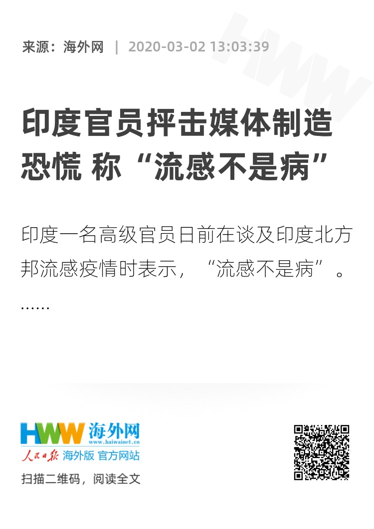 海外网3月2日电 印度一名高级官员日前在谈及印度北方邦流感疫情时表示,无论是猪流感还是其他变异的流感,都与普通感冒没有什么不同,“这都不是病”。