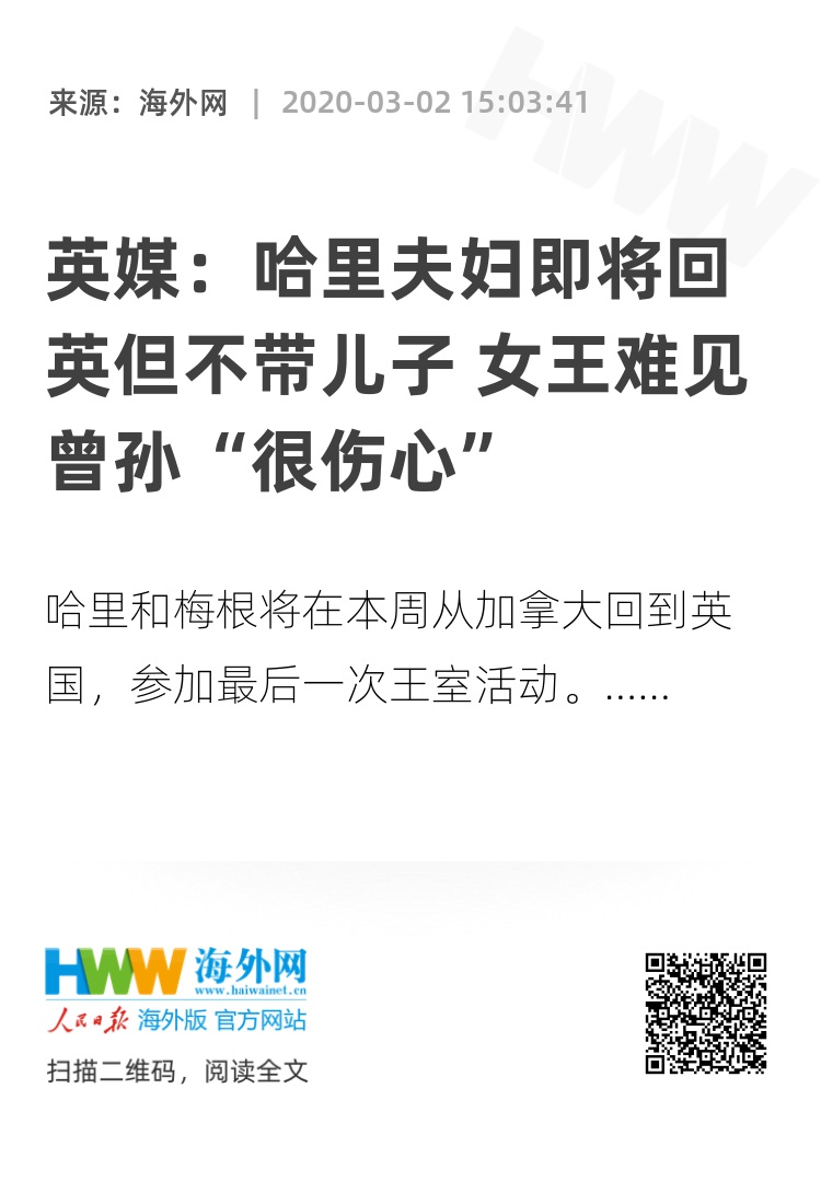 海外网3月2日电 哈里和梅根将在本周从加拿大回到英国,参加最后一次王室活动,但他们不会带9个月大的儿子阿尔奇参加,这让英国女王“非常难过”。