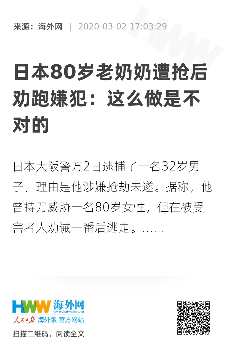 海外网3月2日电 日本大阪警方2日逮捕了一名32岁男子,理由是他涉嫌抢劫未遂。据称,他曾持刀威胁一名80岁女性,但在被受害者人劝诫一番后逃走。