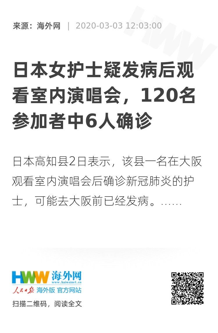 海外网3月3日电 日本高知县2日表示,该县一名在大阪观看室内演唱会后确诊新冠肺炎的护士,可能去大阪前已经发病。据称,约有120人和她观看同场演唱会,其中另有5人已经确诊。