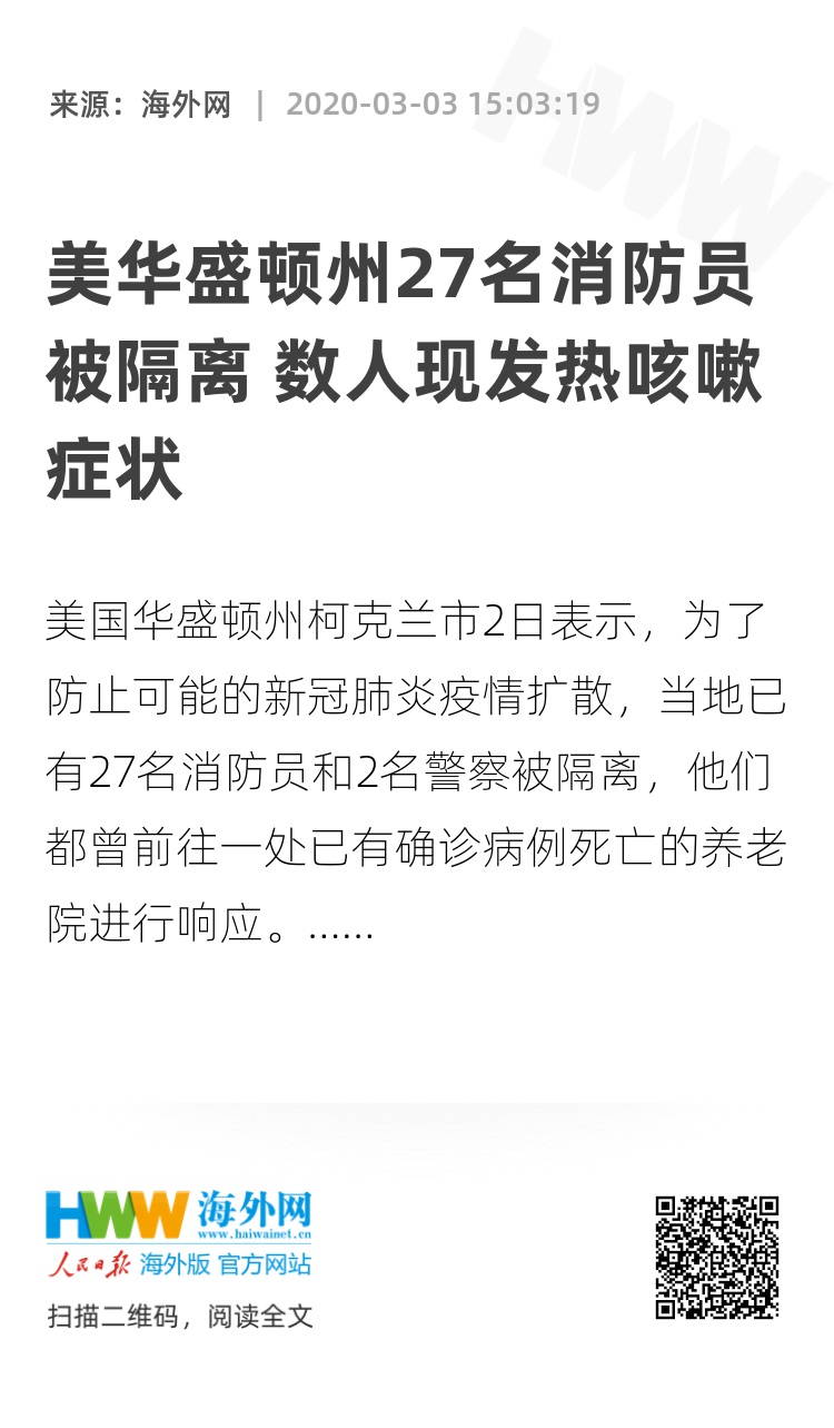综合美国《西雅图时报》、CNN等媒体2日报道,柯克兰市发言人斯蒂克尼表示,在2月28日宣布隔离25名消防员和2名警察后,他们又对另外2名消防员进行了隔离。在这些消防员中,除一人待在消防站中,其余均选择在家隔离。