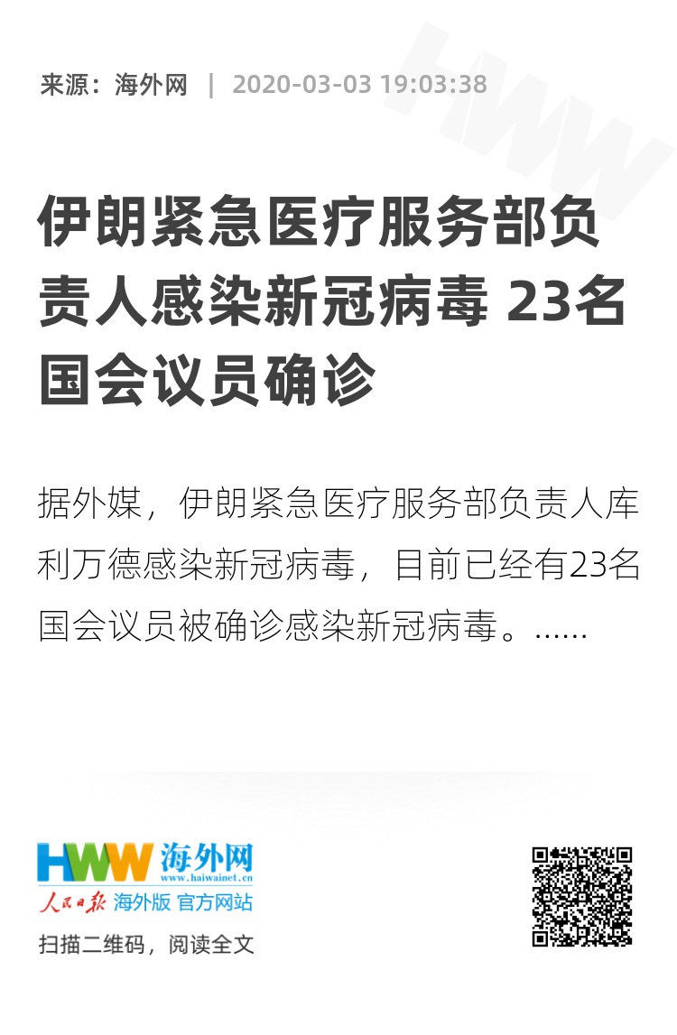 海外网3月3日电 据阿拉伯国有电视台(Al Arabiya)报道,伊朗紧急医疗服务部负责人库利万德(Pir Hossein Kolivand)感染新冠病毒。另据伊朗国家电视台援引国会副议长的消息称,目前已经有23名国会议员被确诊感染新冠病毒。