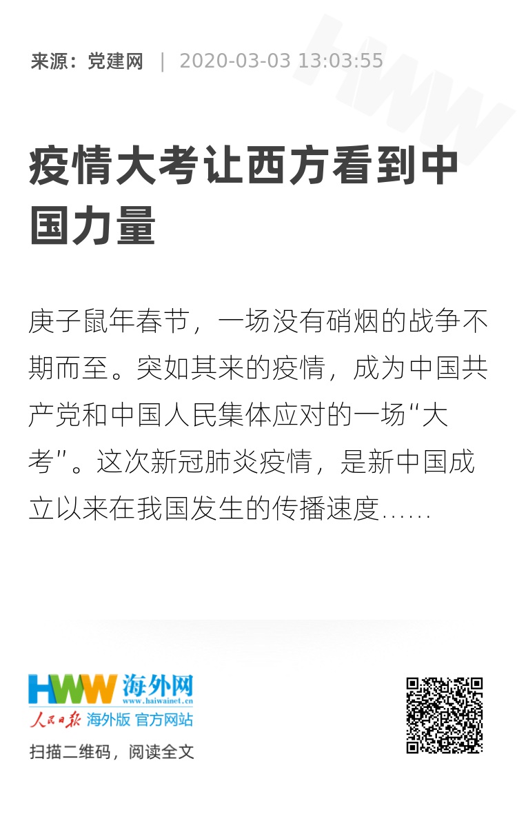 这场疫情大考,中国“答卷”让世界惊叹,更让世界侧目。在短时间内完成一项项看似不可能完成的任务,处处彰显了中国非凡的全民动员能力,展示出中国强大的国家能力。在党中央统一指挥、统一协调、统一调度下,坚定信心、同舟共济、科学防治、精准施策,“全国一盘棋”释放出无穷无尽的战斗力。中国政府高效的治理能力令人肃然起敬。国际社会普遍认为中国采取的坚决有力的防控措施,展现出强大的“领导能力、应对能力、组织动员能力、贯彻执行能力”,生动诠释了什么是“中国力量”。