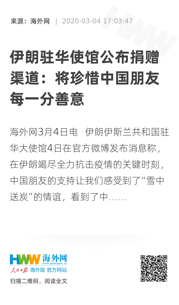 海外网3月4日电 伊朗伊斯兰共和国驻华大使馆4日在官方微博发布消息称,在伊朗竭尽全力抗击疫情的关键时刻,中国朋友的支持让我们感受到了“雪中送炭”的情谊,看到了中国人“滴水之恩,涌泉相报”的品格。连日来,无数中国网友给我们留言询问捐赠渠道事宜,拳拳盛意让我们铭感五内。我们将珍惜中国朋友的每一分善意,追踪每一笔善款的流向。