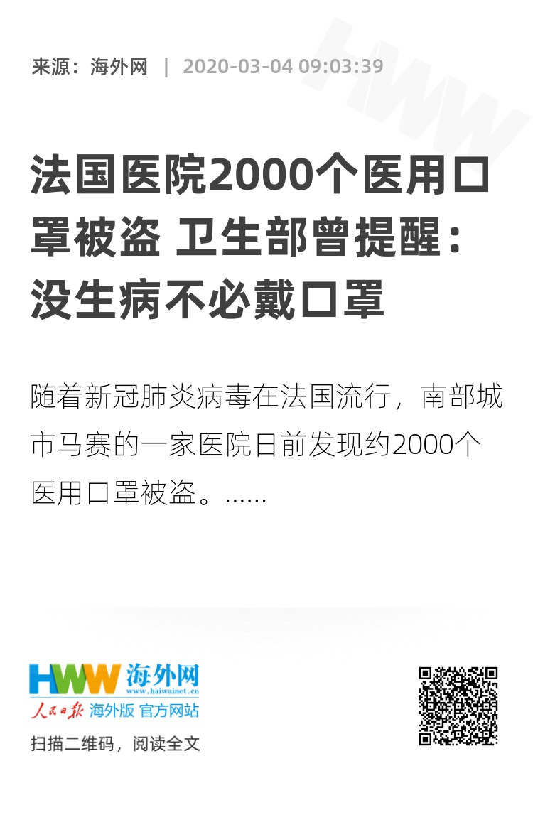 海外网3月4日电 据法新社4日消息称,随着新冠肺炎病毒在法国流行,南部城市马赛的一家医院日前发现约2000个医用口罩被盗。