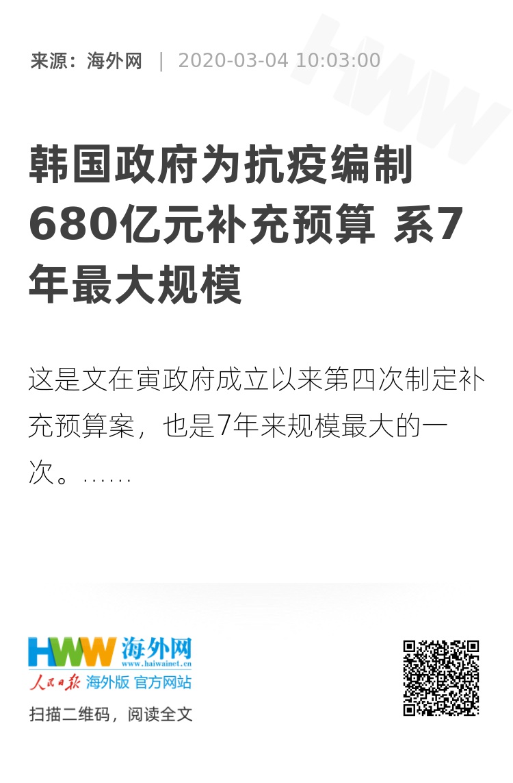韩国政府4日召开临时国务会议,会上敲定包括上述内容在内的补充预算案,并将于5日提交国会。除了加强防疫体系外,韩国政府还将投入巨额资金,刺激受疫情冲击的内需市场。