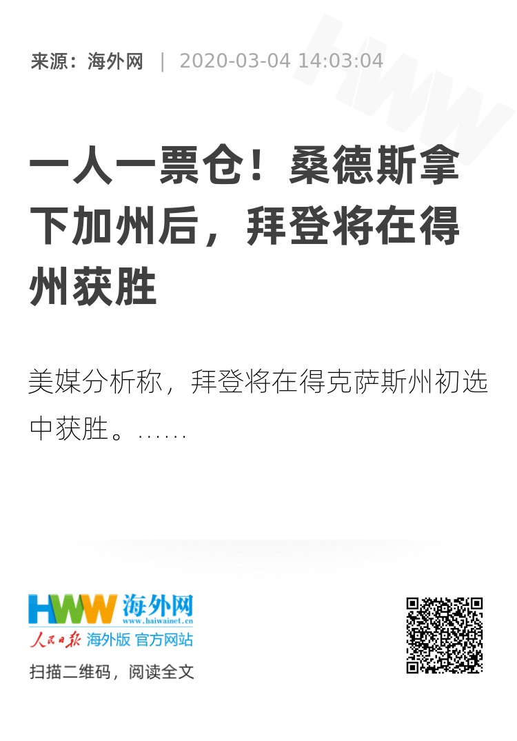 海外网3月4日电 当地时间3日,美国“超级星期二”初选活动正在全国范围内14个州如火如荼地进行。据美联社和NBC分析,拜登将在票仓得克萨斯州取得胜利。此前,多家美媒曾预测桑德斯将拿下另一票仓加利福尼亚州,这也使得两人的竞选对抗更加激烈。