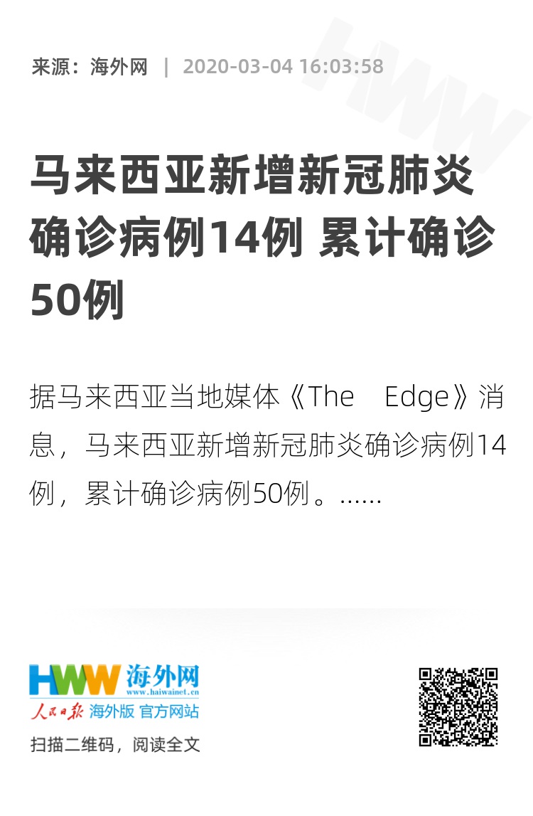 海外网3月4日电 据马来西亚当地媒体《The Edge》4日消息,马来西亚新增新冠肺炎确诊病例14例,累计确诊病例50例。(海外网 王珊宁)