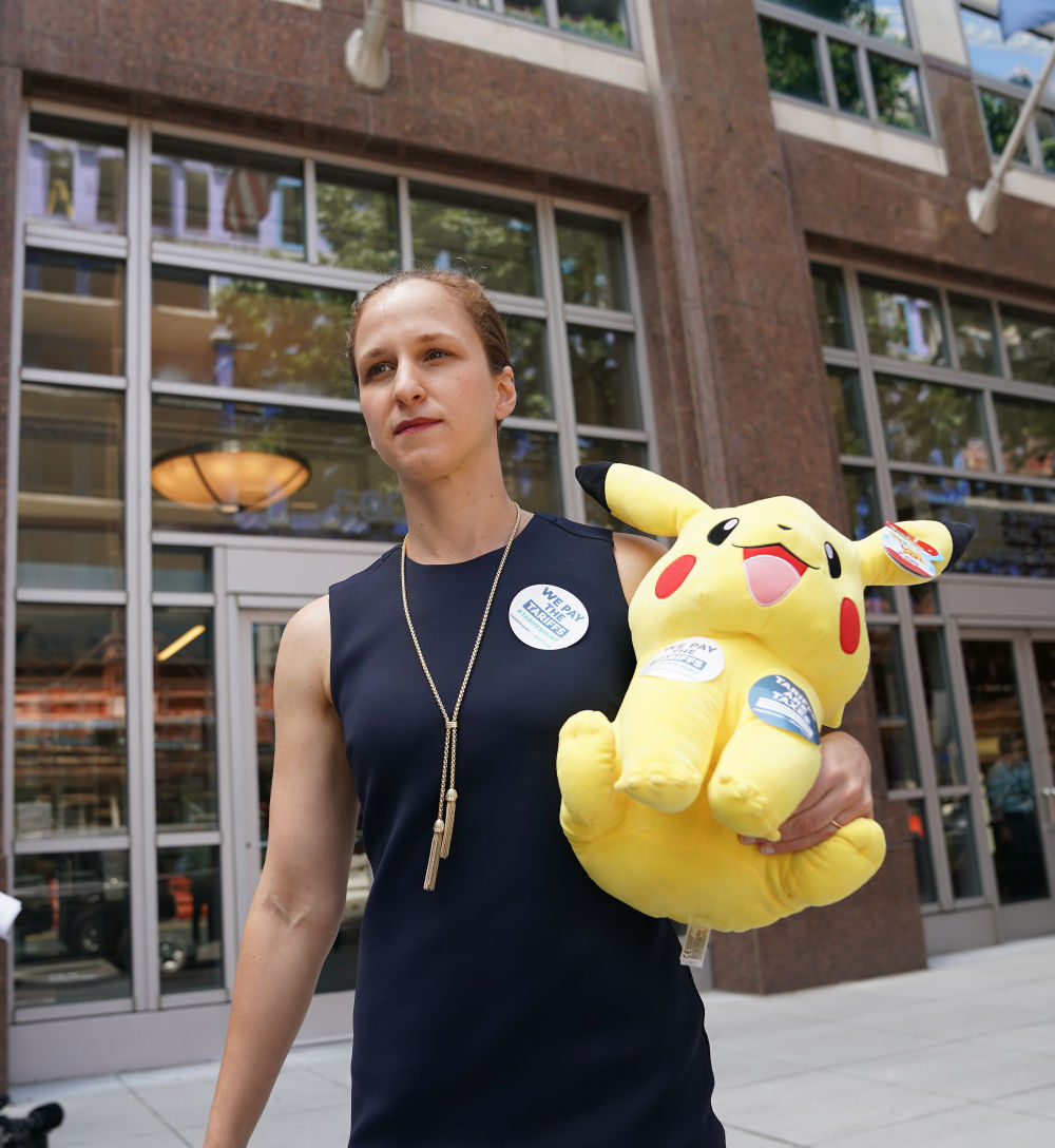 2019年6月17日,在美国华盛顿,美国玩具协会的代表丽贝卡·蒙德拿着一件玩具接受采访,反对加征关税。(新华社记者刘杰摄)
