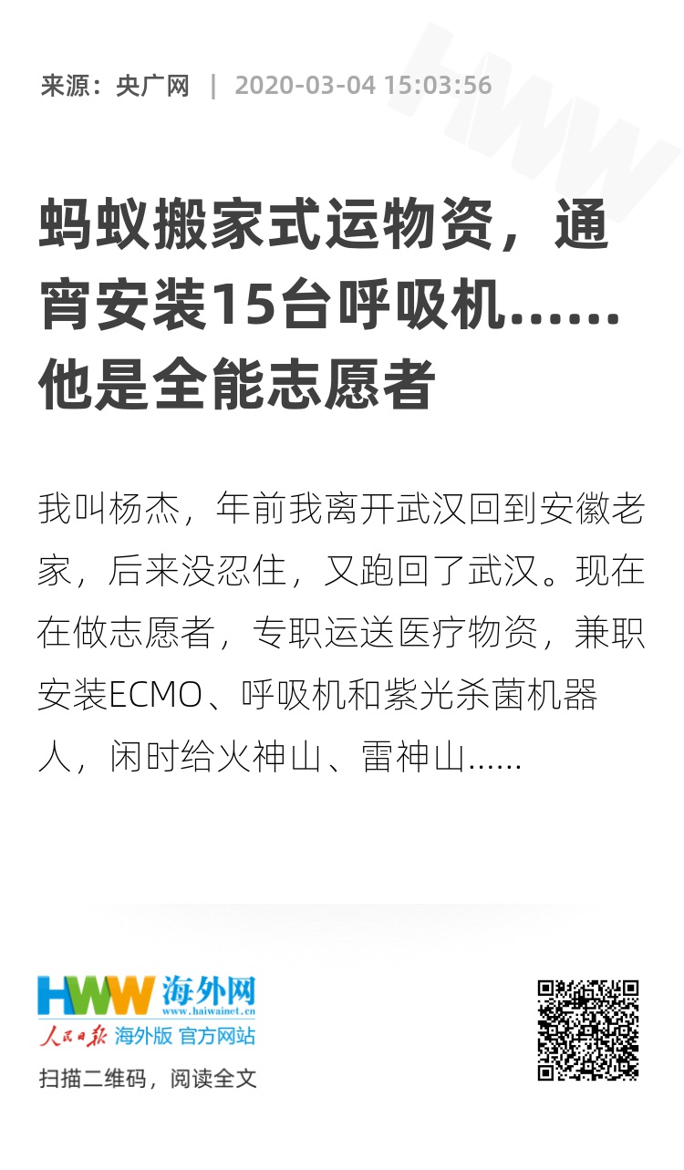我叫杨杰,年前我离开武汉回到安徽老家,后来没忍住,又跑回了武汉。现在在做志愿者,专职运送医疗物资,兼职安装ECMO、呼吸机和紫光杀菌机器人,闲时给火神山、雷神山等医院杀鱼。没错,我就是这么能干!