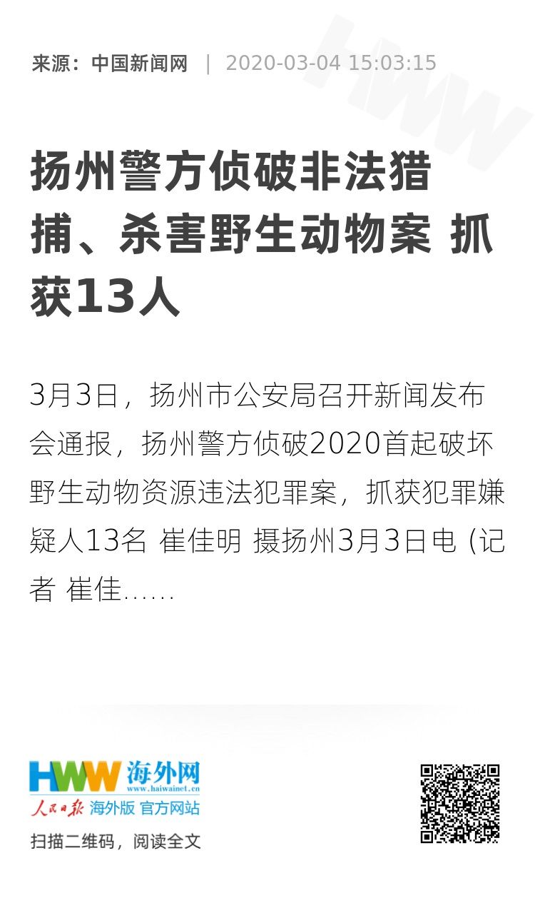 “坚决取缔和严厉打击非法野生动物市场和贸易、坚决革除滥食野生动物陋习”,扬州公安机关“疫”线追踪,依法严厉打击破坏野生动物资源违法犯罪活动,全力打好疫情防控阻击战。