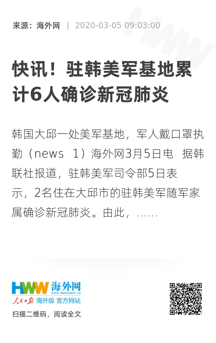 海外网3月5日电 据韩联社报道,驻韩美军司令部5日表示,2名住在大邱市的驻韩美军随军家属确诊新冠肺炎。由此,境内与驻韩美军有关人员中的累计确诊病例增至6例。