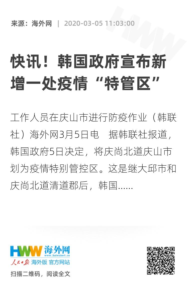 海外网3月5日电 据韩联社报道,韩国政府5日决定,将庆尚北道庆山市划为疫情特别管控区。这是继大邱市和庆尚北道清道郡后,韩国政府划定的第三个特管区。