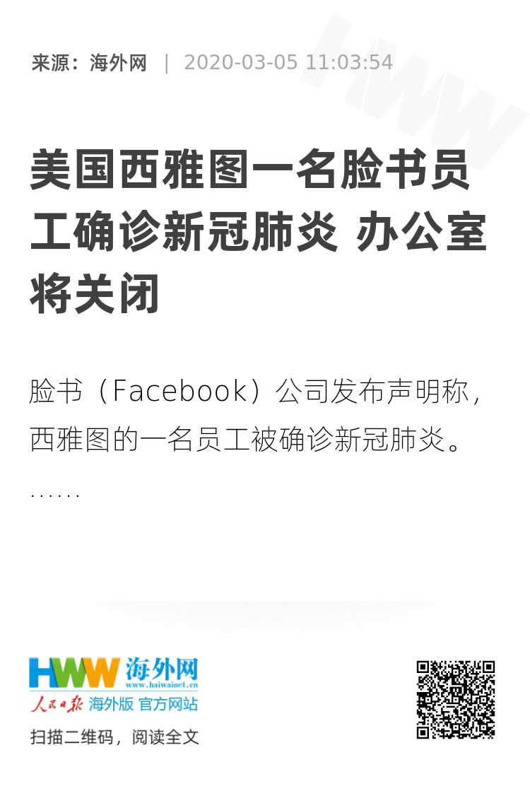 海外网3月5日电 脸书(Facebook)公司发布声明称,西雅图的一名员工被确诊新冠肺炎,这是公司内部首个病例。