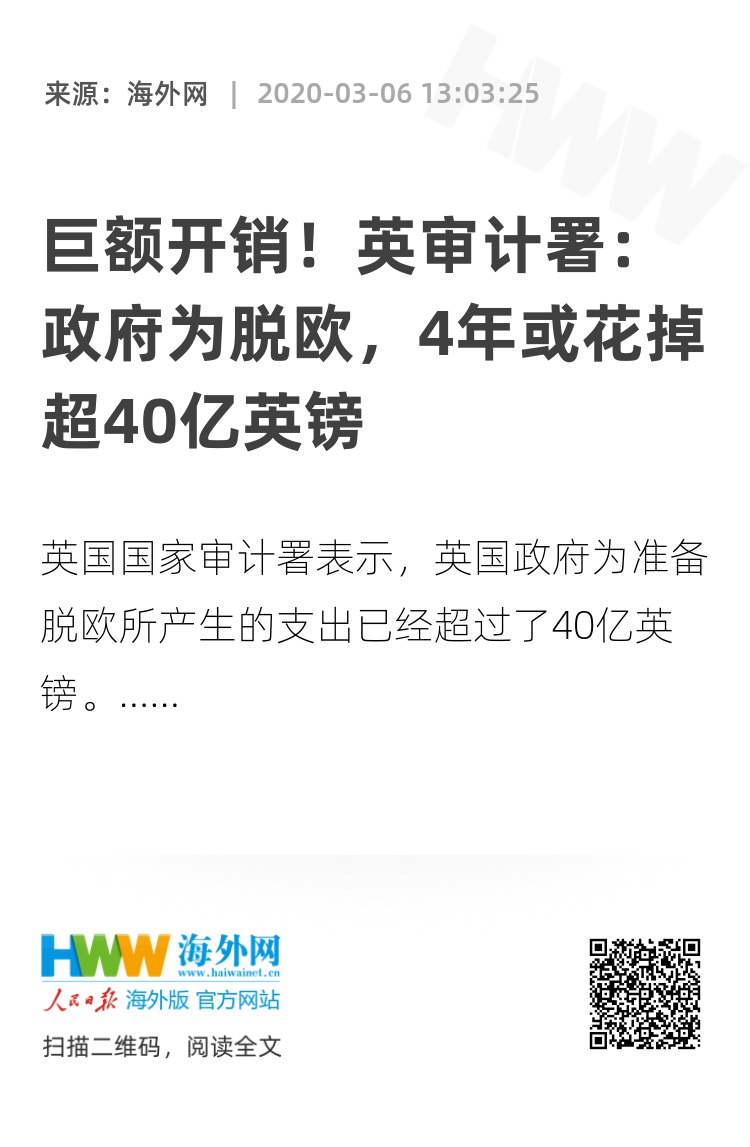据英国天空新闻网报道,审计署方面表示,在2016年6月至2020年3月31日的近四年时间里,英国政府为脱欧事宜花费的总金额将达到44亿英镑。此前,英国财政部下拨的脱欧费用共计63亿英镑,用于有协议及无协议脱欧两种情况的准备。