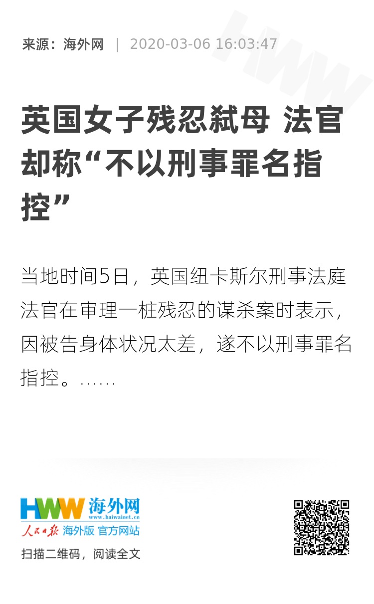 海外网3月6日电 当地时间5日,英国纽卡斯尔刑事法庭法官在审理一桩残忍的谋杀案时表示,因被告身体状况太差,遂不以刑事罪名指控。此案引发英媒关注。