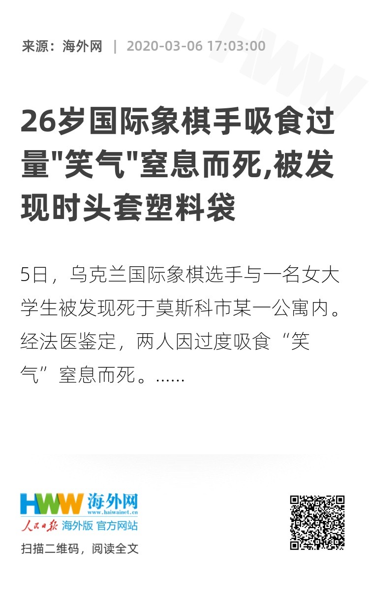 海外网3月6日电 据俄罗斯PEH电视台6日报道,日前一名乌克兰国际象棋选手与一名女大学生被发现死于莫斯科市某一公寓内。经法医鉴定,两人因过度吸食“笑气”窒息而死。