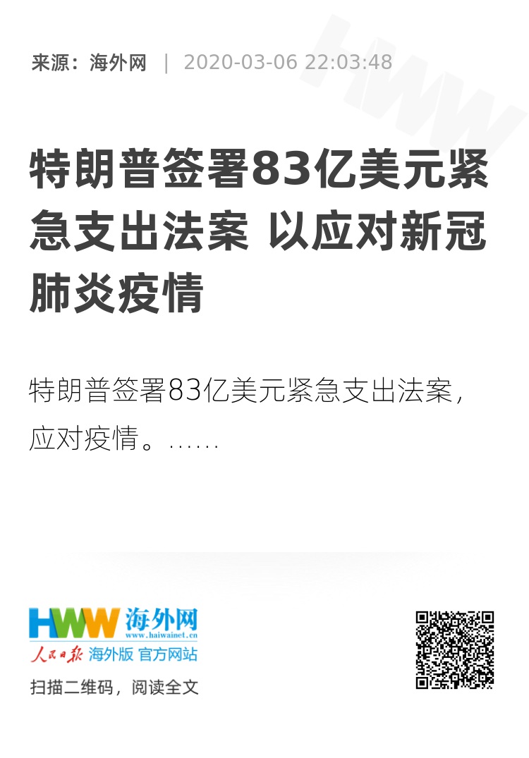 海外网3月6日电 美国总统特朗普6日签署了一项83亿美元(约合人民币574.7亿元)的紧急法案,以应对新冠肺炎疫情。