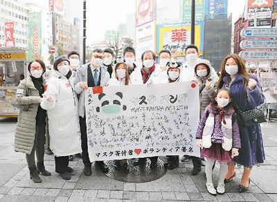图为在日本东京池袋站前,日本华侨华人志愿团体“口罩熊猫行动小组”的志愿者向当地民众发放口罩后合影留念。 新华社记者 杜潇逸摄