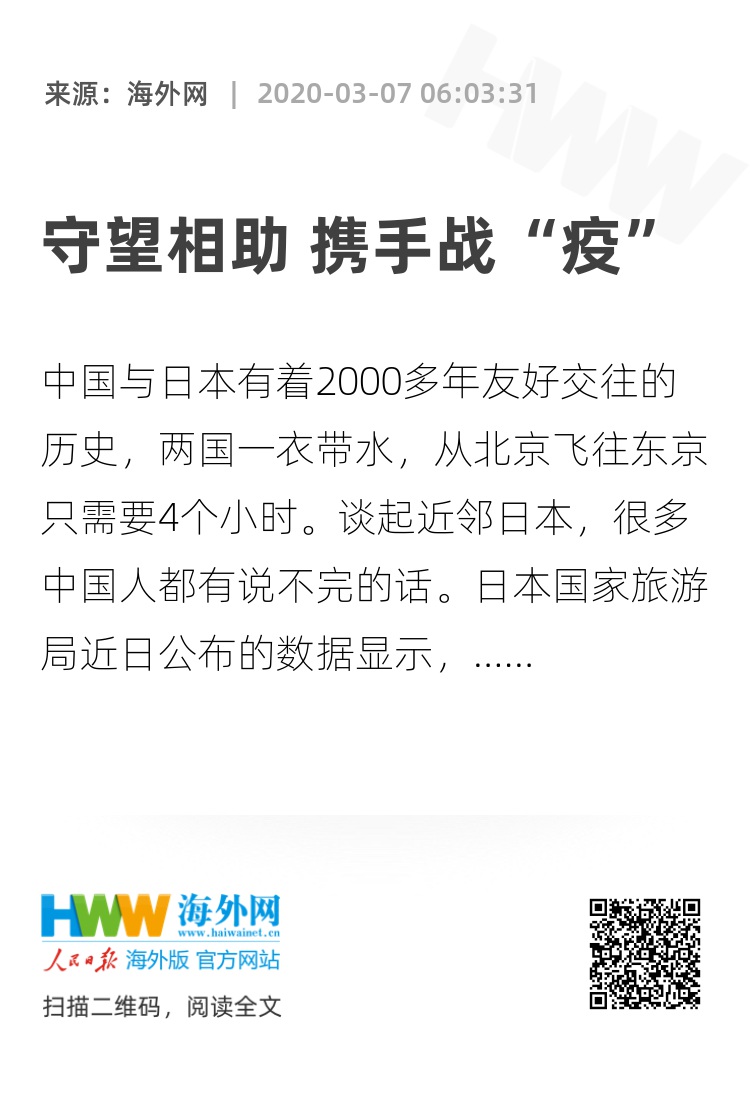 邻里之道,守望相助。近日,日本新冠肺炎疫情也牵动着无数中国人的心。考虑到日方在检测试剂方面面临不足,中国驻日本大使馆主动联系中国国内有关厂家及慈善组织向日方紧急提供了一批病毒检测试剂;中国企业、华侨华人志愿者团体走上东京、大阪、名古屋等日本多地街头,为日本人免费赠送口罩……中日守望相助、共克时艰的点点滴滴,正在汇聚成两国携手抗击疫情的强大力量,推动中日关系走好走顺。(刘军国)