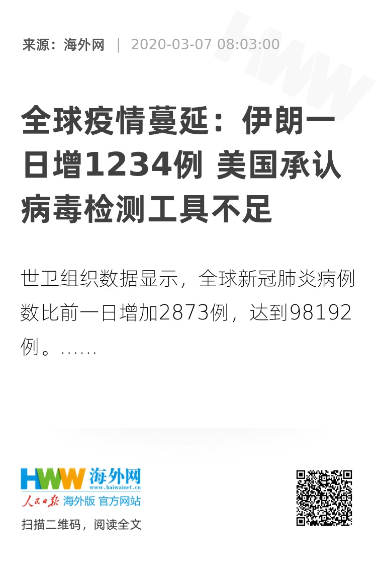 海外网3月7日电 新型冠状病毒疫情在全球持续蔓延扩散,目前除南极洲外六大洲均有确诊病例。世界卫生组织6日表示,截至欧洲中部时间6日10时(北京时间6日17时)收到的各国报告数据,中国境外新冠肺炎病例数达到17481例。世卫组织数据显示,全球新冠肺炎病例数比前一日增加2873例,达到98192例;死亡病例比前一日增加99例,为3380例。