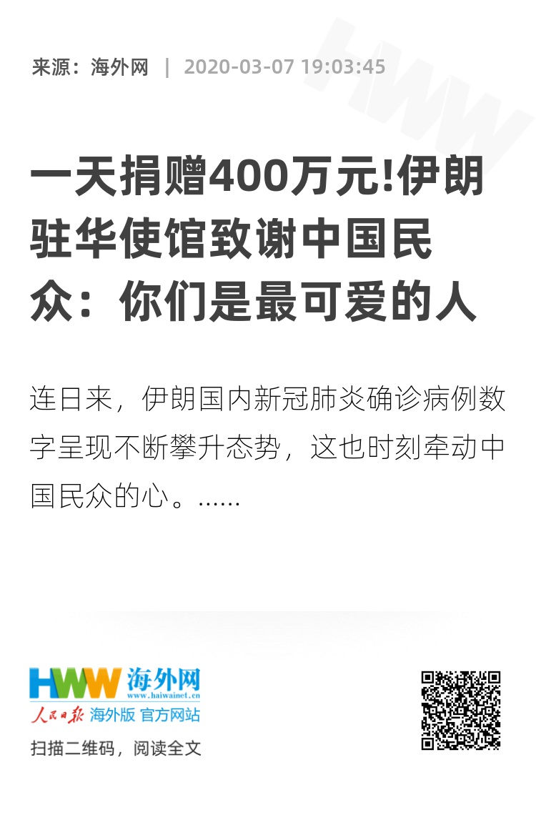 伊朗驻华使馆发文称,今天又是充满感动的一天。这一天,使馆看到了马云为伊朗筹集到100万只口罩的消息,一位卧病在床的老先生给使馆打来了慰问视频电话,还有一对老夫妇亲自到使馆捐赠。一些企业将多方筹措的防疫物资专程送到使馆,更有无数中国网友踊跃捐款捐物……细数种种,使馆在文末写道,“虽然我们可能无法得知每一位捐赠者的名字,但我们将永远铭记:你们是最可爱的中国人!”