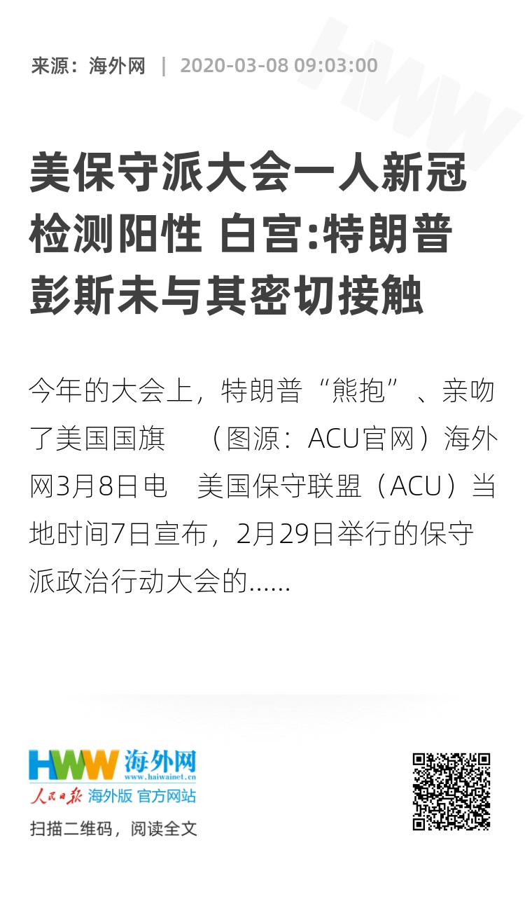 海外网3月8日电 美国保守联盟(ACU)当地时间7日宣布,2月29日举行的保守派政治行动大会的一名与会者新冠肺炎检测呈阳性,美国总统特朗普、副总统彭斯等政府官员都曾出席此次大会。随后白宫发布声明,表示没有迹象表明特朗普或彭斯和此人密切接触。