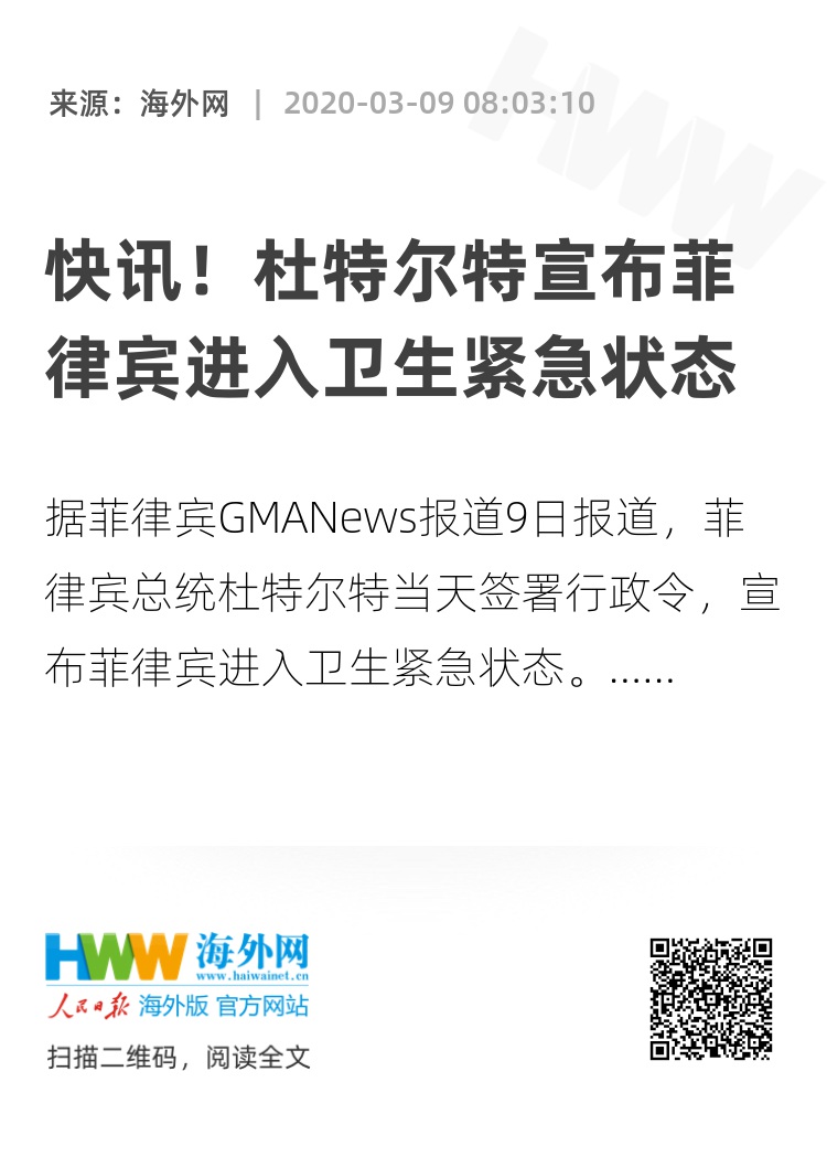 【海外网快讯】 据菲律宾GMANews报道9日报道,菲律宾总统杜特尔特当天签署行政令,宣布菲律宾进入卫生紧急状态。