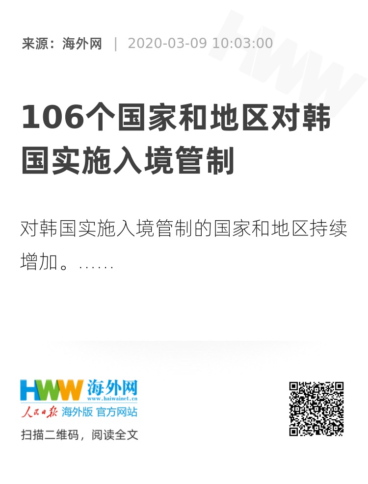 海外网3月9日电 据韩联社报道,韩国外交部称,截至当地时间9日上午9时,对韩国采取入境管制措施的国家和地区为106个,较前一日(8日)增加2个,分别是格林纳达和巴巴多斯。
