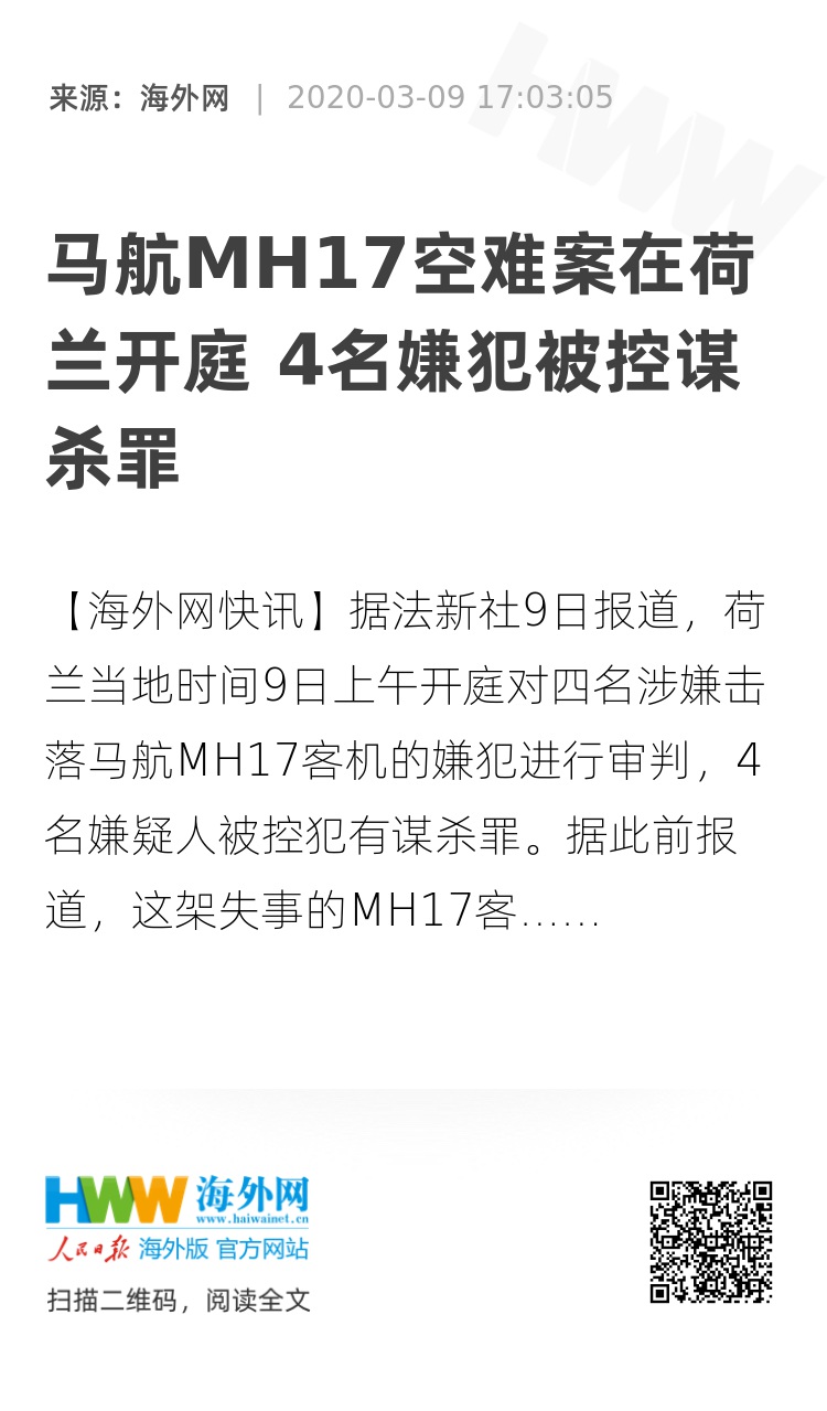 据此前报道,这架失事的MH17客机于2014年7月17日从荷兰阿姆斯特丹市飞往马来西亚首都吉隆坡,在乌克兰靠近俄罗斯的东部边境坠毁,包括196名荷兰人在内,298名乘客和机组人员全部遇难。荷兰安全委员会2015年10月发布调查报告,认定客机遭一枚“山毛榉”导弹击落。