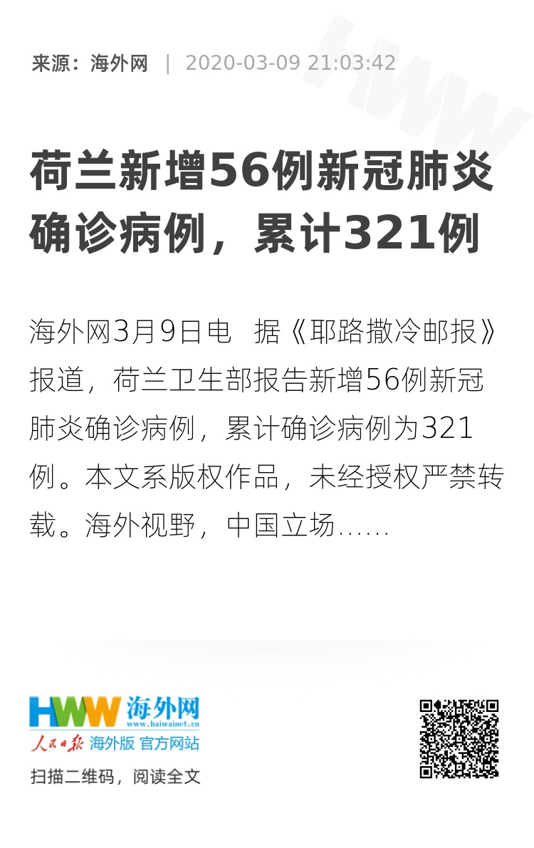 海外网3月9日电 据《耶路撒冷邮报》报道,荷兰卫生部报告新增56例新冠肺炎确诊病例,累计确诊病例为321例。