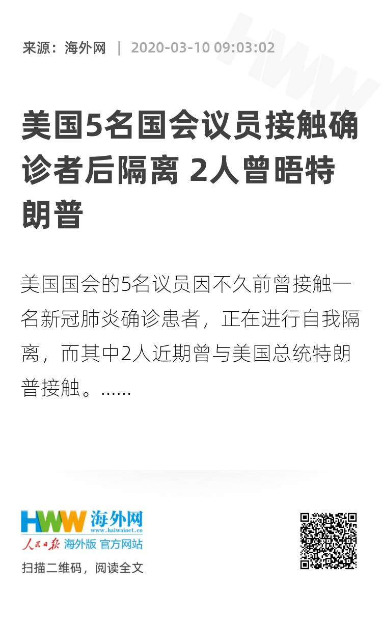 海外网3月10日编译报道 因不久前曾接触一名新冠肺炎确诊患者,美国国会的5名议员正在进行自我隔离,而其中2人近期曾与美国总统特朗普接触过。