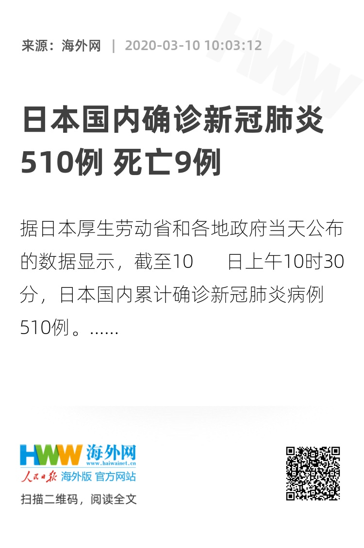【海外网快讯】日本放送协会(NHK)10日消息,据日本厚生劳动省和各地政府当天公布的数据显示,截至10 日上午10时30分,日本国内累计确诊新冠肺炎病例510例。