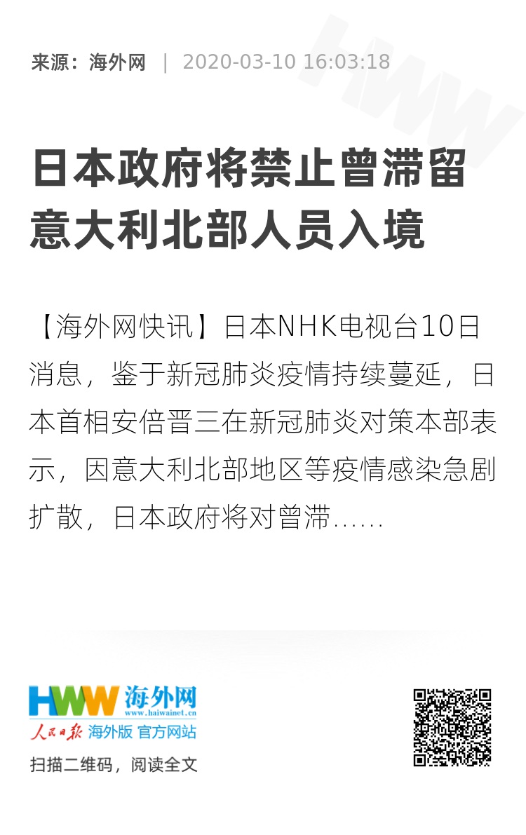 【海外网快讯】日本NHK电视台10日消息,鉴于新冠肺炎疫情持续蔓延,日本首相安倍晋三在新冠肺炎对策本部表示,因意大利北部地区等疫情感染急剧扩散,日本政府将对曾滞留该地区的人员实施入境管控措施。这是日本首次将拒绝入境的对象扩展至欧洲国家。(海外网 王珊宁)