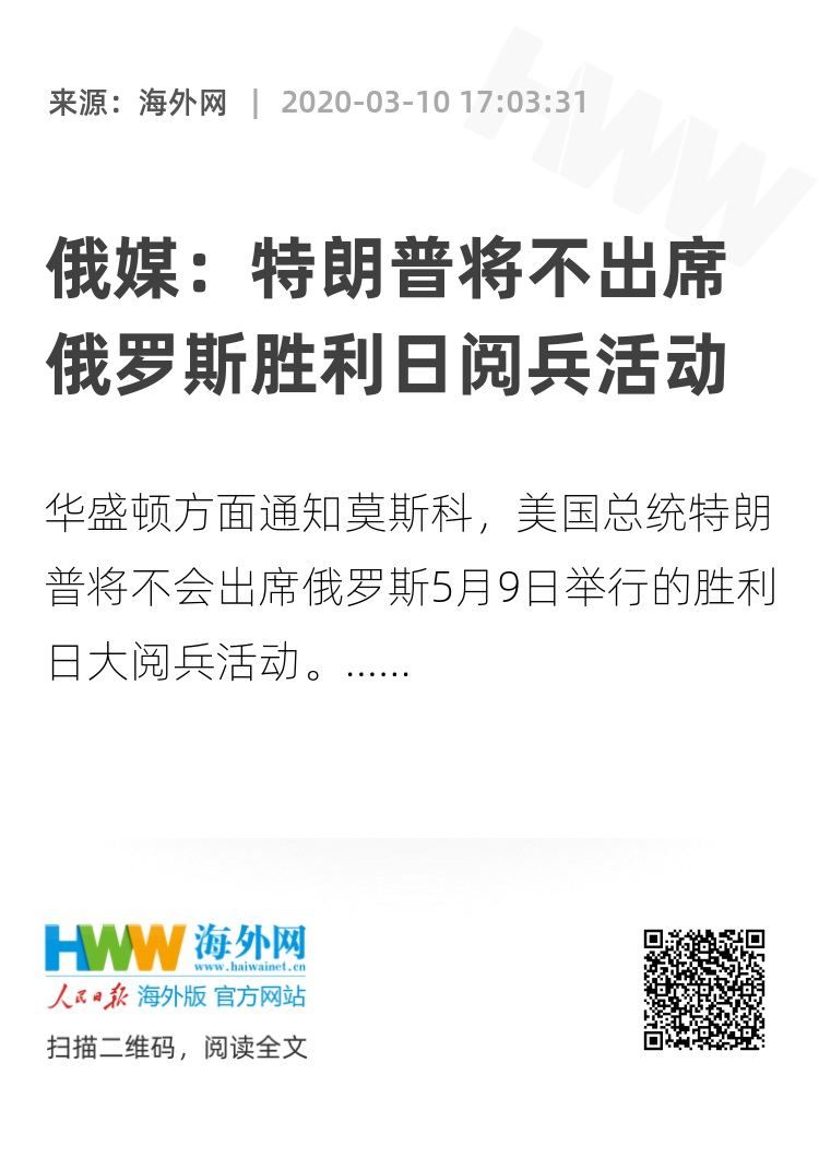 【海外网3月10日编译报道】俄罗斯《生意人报》10日消息,华盛顿方面通知莫斯科,美国总统特朗普将不会出席俄罗斯5月9日举行的胜利日大阅兵活动。今年的红场胜利日阅兵是庆祝苏联二战胜利75周年的活动。
